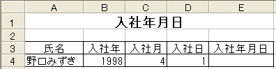 下図のようにワークシートに入力し、日付の形式に変換した入社年月日をセルE4に表示させましょう。